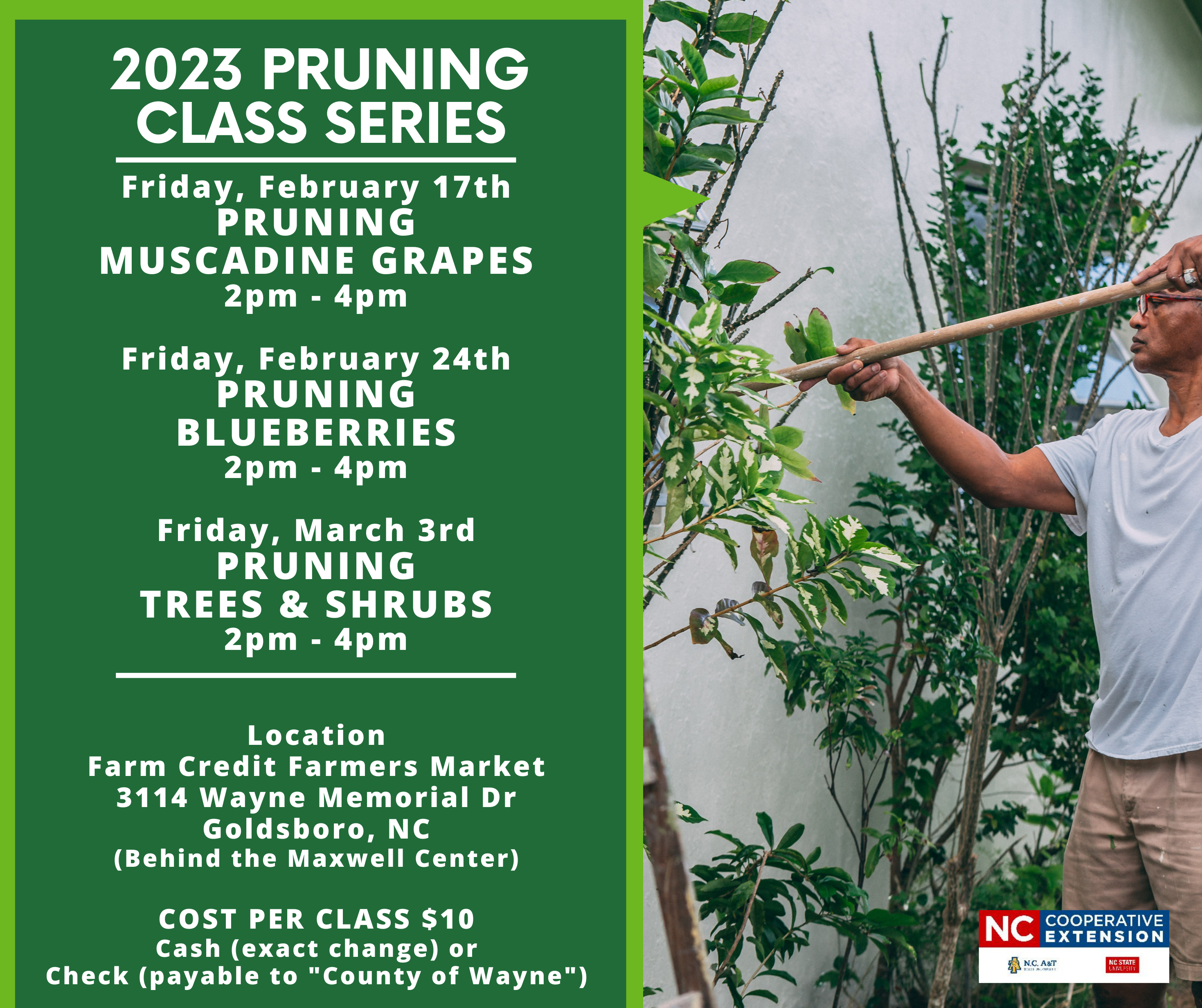 Collapse ▲Join us for our Pruning Blueberries class on Friday, February 24th from 2 p.m. to 4 p.m. at the Farm Credit Farmers Market (3114 Wayne Memorial Dr. Goldsboro).